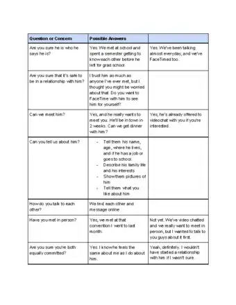 - Make two columns: one lists the concerns and questions they may have, and the other column lists your responses.