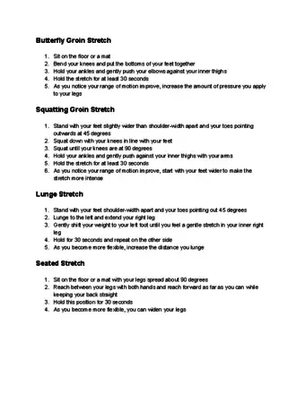 - Perform a simple stretch that targets the groin area before and after you work out or participate in sports. Sit on the floor with your back gently against the wall. Place the bottoms of your feet together and pull your feet in toward your groin. Gently and slowly move your knees toward the floor. Hold this stretch for 20 seconds and repeat once.[39]