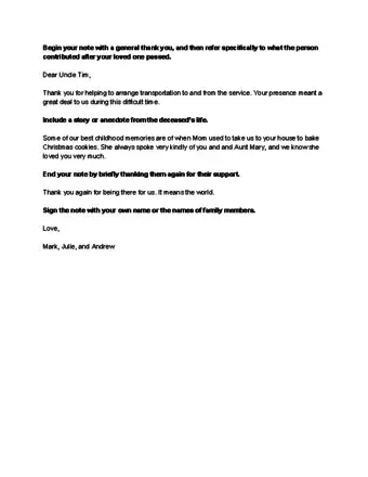 • If you are especially close to the person you’re thanking, feel free to include a personal anecdote or story from the deceased’s life, if you share one with whomever you’re thanking. Personalizing your thank you notes is always a nice touch, but certainly don’t feel that you must do this.