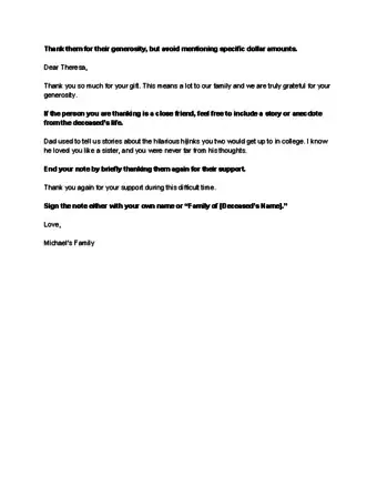 • Good phrasing for a monetary donation might read like "Thank you for your generosity in our time of grief. The donation in honor of [deceased's name] means a lot to us." This way you convey your appreciation without mentioned how much they gave.[7]