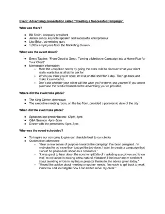 - You might include a listing of your event program. You should also discuss who the key participants were in the event at some point. Keep these sections brief, though.