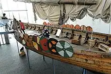 From there the ship sailed, via several ports of call in Newfoundland,[1] to New York City, where she arrived on 5 October, approximately 3 months after the start of the voyage.[3] Íslendingur was laid up in Westbrook, Connecticut. A deal to use her in advertising fell through because of the 9/11 attacks.[7] In 2002 she was purchased by an Icelandic consortium led by the region of Southern Peninsula. She was displayed in the open air on the coast in Reykjanesbær until she could be moved into the newly constructed Viking World museum in 2008.[8] She is suspended one and a half metres above the ground so that visitors can walk underneath her hull and observe the workmanship.[3]