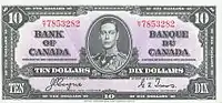 The 1937 Canadian banknote series is the second series of banknotes of the Canadian dollar issued by the Bank of Canada. The banknotes were issued into circulation on 19 July 1937,[1] at which time the Bank of Canada began gradually removing banknotes from the 1935 series from circulation.[2] The $1000 banknote was issued several years later, as it was primarily used by chartered banks, which had a sufficient supply of the 1935 Series $1000 banknote.[3]
