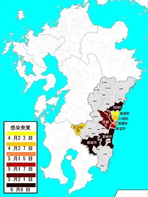 - ↑ "Japan". Governor Higashikokubaru announced the disease was eradicated. Archived from the original on 2010-08-27. Retrieved 2010-08-27.