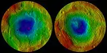 - 1 2 3 Schenk, P.; et al. (2012). "The Geologically Recent Giant Impact Basins at Vesta's South Pole". Science. 336 (6082): 694–697. Bibcode:2012Sci...336..694S. doi:10.1126/science.1223272. PMID 22582256. S2CID 206541950.