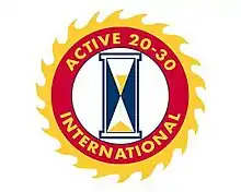 The Active 20-30 International emblem is a buzz saw encircling an hourglass and inscribed "Active 20-30 International."