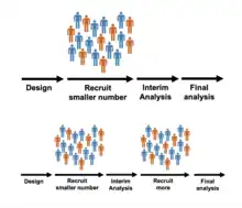 | Group sequential | Sample size, by a set interval at a time. | Sample sizes can be changed. These trials usually change the sample size by adding or removing set-blocks of patients such as adding 20 patients at a time, and then re-evaluating. This type of design is explained in detail on PANDA.[5] |