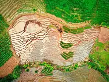 The main source of revenue of agriculture in Sri Lanka is smallholder farming in paddy and vegetable cultivation. This sector is crucial to the country's economy: comprising 7.8 percent of GDP and employing 28% of the labor force.[18] However, climate change is taking a toll on domestic market, food security, and export potential.[19] The main crops in Sri Lanka are particularly sensitive to variation in temperature and precipitation. Near-coastal areas like fertile strips of land that are critical for production of rice and coconuts, two major exports and nutritional staples are under threat from saltwater intrusion and extreme weather events, particularly drought. As a result, various types of food insecurity and malnutrition are still prevalent and show high regional disparity which is likely to worsen in the face of climate change. Additionally, poor infrastructure in rural areas severely constrains farmers in bringing goods to market. Rivers on the wetzone of the country feed agricultural irrigation systems, which covers 13 percent of the cropped land. The increase of flood and drought frequency may lead to straining these systems especially in the dry zone where 70 percent of the rice paddies are located. The three most water marginalized irrigation districts are Thanamalwila, (Moneragala District), Anamaduwa (Puttalam District), and Horowpothana (Anuradhapura District).[20]