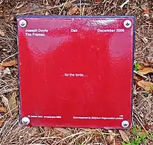 In the first phase of the project, with a target of 625 donors,[4] around 635[lower-alpha 2][9][14] trees were sponsored, with oak and wild cherry the most-chosen, and just a few of the most costly, the evergreen oak, as well as maple, cedar and pine. The total contributed by sponsors was around 45,000 euro.[4] Some corporate sponsors, including McInerney and Bruce Shaw, donated trees on behalf of community organisations, as well as the comprehensive school.[17] Each sponsor was invited, over a period of 18 months, to a face-to-face meeting with the artist. At this meeting Gerz explored the concept of the project and worked with the sponsor to develop a short text answering the question "If this tree could speak, what would it say for me?" to be printed on an enamelled plaque or lectern by their chosen tree.[2][5] Donors were also asked to choose in which neighbourhood of Ballymun the tree should be planted. The project reported that the choice of locations proved challenging, due to both the massive demolition and construction work ongoing across Ballymun, and to other, more routine, tree planting work.[9]