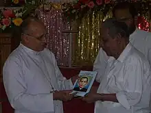 Mar Jacob Manathodath, Former Apostolic Administrator of Ernakulam-Angamaly, releasing the biography of Venerable Payyappilly Mar Varghese Kathanar during his 82nd death anniversary by handing over a copy of it to his great-nephew Mathai Payyappilly Palakkappilly