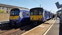 At its opening, the rolling stock on the Argyle Line was Class 314 electric multiple units, which were then new.[40] These were accompanied by a number of the older Class 303[41] "Blue Train" sets from the North Clyde route. In the late 1980s and early 1990s, Class 311 trains also operated on this route. After the 303s were retired in 2002, the route was operated by a mixture of new Class 334 Alstom "Juniper" units,[42] alongside a small number of 1980s vintage Class 318[43] trains cascaded from the Ayrshire routes, with the original Class 314 sets transferred to the Cathcart Circle. Following the opening of the Airdrie-Bathgate rail link, most Class 334 units were transferred to services on this route. The Class 320s were subsequently fitted with yaw dampers, allowing for 90mph running up from their previous 75mph limit, which enabled them to replace the Class 334s on the Argyle Line
