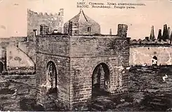 In 1876 English traveler James Bruce visited Ateshgah. He noted that the Bombay Parsi Punchayat provides a permanent presence in the temple of their priest.[42] Pierre Ponafidine visited the temple at the same time and mentioned about two priests from Bombay.[43] E. Orsolle, who visited the temple after Bruce, said that after Parsi priest died in 1864, the Parsi Punchayat of Bombay a few years later sent another priest here, but the pilgrims who came here from India and Iran have already forgotten the sanctuary, and in 1880 there was nobody.[44] O'Donovan visited the temple in 1879 and refers about religious worship of Guebres.[45]