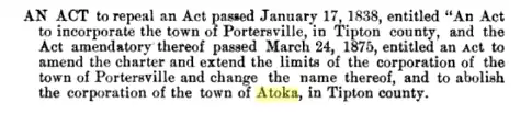 Atoka and Portersville in Tennessee, U.S.A.
