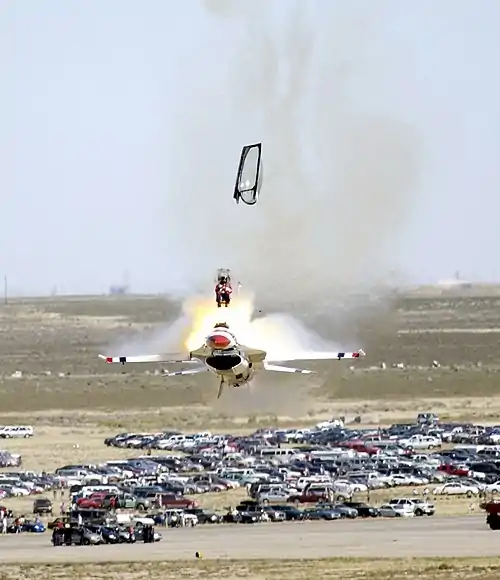 A USAF Thunderbird pilot ejecting from his F-16 aircraft at an air show in 2003