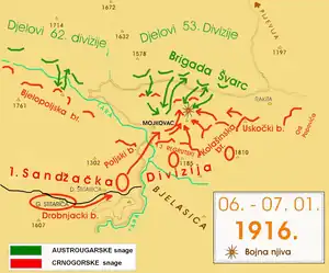The fighting culminated on 6 and 7 January 1916 (on Orthodox Christmas, also known as 'Bloody Christmas'). Led by Serdar (Vojvoda) Janko Vukotić[3] with Krsto Popović as second in command, the Montenegrins inflicted heavy casualties on the Austro-Hungarians and temporarily halted their advancement.
