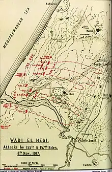By the autumn of 1917 the EEF had been revitalised by the arrival of Sir Edmund Allenby as commander-in-chief, and the next operation (the 3rd Battle of Gaza, 31 October–7 November) was much better planned and successful. 52nd (L) Division down on the coast carried out a holding action while the Desert Mounted Corps swept round the Turkish flank. The Turks withdrew to defend the Wadi el Hesi, with 52nd (L) Division well up in pursuit. 157th Brigade led this pursuit, having been in reserve, and made for the mouth of Wadi el Hesi, accompanied by artillery and cavalry. 5th HLI captured the first part of 'Sausage Ridge' during the night of 7/8 November and 7th HLI,[lower-alpha 1] (now commanded by Lt-Col Edward Gibbons, originally of the Middlesex Regiment) pressed forward to extend 5th HLI's line down to the sea, and by dawn had secured both sides of Wadi Hesi. Daylight showed a sand ridge still occupied by the enemy from which they could bring down fire on the division crossing the mouth of the wadi, but a company of the 7th HLI advanced under heavy shell, machine gun and rifle fire across the sand ridge 'as if it was carrying out a parade movement'. The rest of the division followed up and took the rest of Sausage Ridge. The Turks retreated leaving behind large quantities of stores. 7th HLI's casualties in this successful operation were 6 ORs killed and 6 missing, 1 officer and 55 ORs wounded.[21][45][46][47]