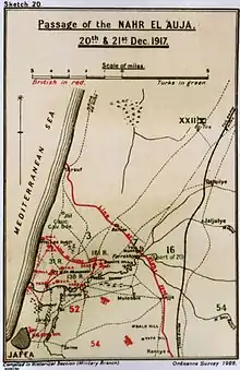 After breaking this counter-offensive, the EEF captured Jerusalem on 11 December.[56] 52nd (L) Division's next operation was the tricky passage of the Nahr el Auja to launch the Battle of Jaffa. The troops practised using canvas boats on a village pond, then at 22.30 on the evening of 20 December the first assaulting waves went forward under cover of an artillery barrage. 7th HLI, under Lt-Col Gibbons, had the task of landing, then attacking the flank of the Turkish trenches defending the ford. All four companies were across by 01.00 on 21 December, and began their attack from an unexpected direction, quickly clearing the flooded Turkish trenches and dugouts. The battalion then signalled the rest of the brigade to cross by the ford, but the ford could not at first be found in the flooded river. By daybreak the division held a significant bridgehead, and the Royal Engineers were constructing pontoon bridges for the artillery. The advance was renewed up the coast on the morning of 22 December, with fire support from HMS Grafton and gunboats, until 52nd (L) Division reached the castle of Arsuf, overlooking the Plain of Sharon, where it halted. The Official History describes the passage of the Auja as 'one of the most remarkable feats of the Palestine Campaign'. 7th HLI suffered only 5 casualties.[21][57][58][59]