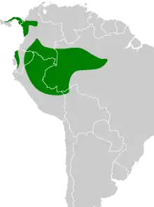 It is found in Bolivia, Brazil, Colombia, Ecuador, Panama, and Peru. Its natural habitat is subtropical or tropical moist lowland forests.