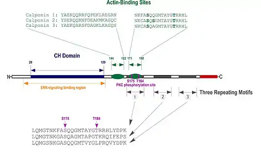The CH domain was found in a number of actin-binding proteins (such as α-actinin, spectrin, and filamin) to form the actin-binding region or serve as a regulatory structure.[13] However, the CH domain in calponin is not the binding site for actin nor does it regulate the modes of calponin-F-actin binding.[14] Nonetheless, CH domain in calponin was found to bind to extra-cellular regulated kinase (ERK) for calponin to play a possible role as an adaptor protein in the ERK signaling cascades.[15]