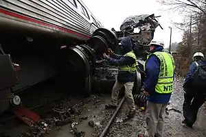 The National Transportation Safety Board (NTSB), the Federal Railroad Administration, and CSX Transportation began investigations shortly after the accident.[1][2] On July 23, 2019, NTSB publicly announced that Amtrak's and CSX Transportation's failure to properly assess and mitigate the risk of conducting switching operations during a signal suspension, coupled with a CSX conductor's error, led to the collision of the Amtrak train with the CSX train.[5] Amtrak locomotive No. 47 was severely damaged and was scrapped, and CSX locomotive No. 130's cab and front area was completely destroyed. No. 36 suffered minor damage and was repaired and put back into service now repainted into the YN3B paint scheme. Nos. 130 and 36 were both towed to the nearest CSX shop, where No. 130 was cut up and scrapped.