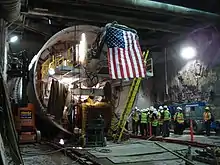 A study released in 2000 called for the Central Subway as part of a larger plan to alleviate projected traffic gridlock which also included a light rail line along Geary.[19] Voters approved the Central Subway in 2003, and the alignment was selected in 2008.[20][21] Ground was broken for the project on February 9, 2010,[22] however, physical work did not begin until June 2012. The first phases of work included preparation of the tunnel boring machine launch site and headwalls for the Yerba Buena/Moscone Station.[23] At the time, the FTA grant had not been secured, and opponents were threatening lawsuits over potential disruption to traffic and businesses.[24]