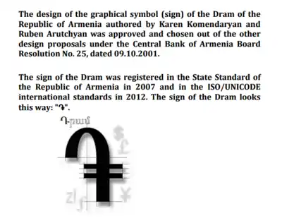 The national currency of the Republic of Armenia is dram (ISO code - AMD, the sign - ). One dram is equal to one hundred luma. The CBA is vested with the exclusive right to issue currency. The national currency was put into circulation on 22 November 1993. The design of the graphical symbol (sign) of the Dram of the Republic of Armenia authored by Karen Komendaryan and Ruben Arutchyan was approved and chosen out of the other design proposals under the Central Bank of Armenia Board Resolution No. 25, dated 09.10.2001. The sign of the Dram was registered in the State Standard of the Republic of Armenia in 2007 and in the ISO/UNICODE international standards in 2012. On September 21, 1991 Armenia was proclaimed as an independent republic. On this occasion there arose a need to create a national currency. On March 27, 1992, the name was chosen for the Armenian currency, the Dram, and sketches of the future banknotes were prepared. The first series of banknotes of 10, 25, 50, 100, 200 and 500 dram entered into circulation on November 22, 1993. Then, in 1994 banknote series was added with the banknote of 1 000 dram denomination, and later, in 1995, with 5 000 dram banknote. The design of the banknotes contained images of modern and historic, architectural and cultural monuments of Armenia. While working on the first series of banknotes, the Central Bank of the Republic of Armenia actually started a tradition of representing on them the most important aspects of the Armenian cultural and historical heritage. Banknotes of the first series circulated until 2005, although since 1995, work began on the development of a new, second series of banknotes. The design concept changed definitely. Banknotes became more sophisticated in terms of technical parameters: they were more in line with international standards and the latest international trends. The banknotes which replaced the first series began portraying the most famous personalities who have left an invaluable imprint on the culture and historical heritage of Armenia. In the period from 1999 to 2010 banknotes of 50, 100, 500, 1 000, 5 000, 10 000, 20 000, 100 000 dram were in circulation. The first two of them are not circulating nowadays. On June 4, 2001, the first commemorative banknote of 50,000 dram to celebrate the 1700th anniversary of the adoption of Christianity as the state religion in Armenia was issued. The design of the banknote was different from the general concept adopted for the second series of the Armenian banknotes. The banknotes of the second series, including the commemorative one, were re-issued in the form of reprints, keeping with the overall design as well as inscriptions. In the process of reprinting particular attention was paid to improving the security of banknotes and bettering their overall quality. Nearly all the achievements of modern security technologies – varnishing, use of holograms, OVI, etc. – were introduced. The number of security features at the moment reaches 17, which is why the Armenian banknotes are able to meet the highest standards accepted in security printing. The most important work was done during the last reprint of banknotes of 1 000, 5 000, 10 000 and 20 000 dram banknotes. All design elements were optimized and consolidated; modern security features appeared not only on the obverse, but on the reverse of the banknotes as well. This work has earned high praise of international community. In particular, at the international conference of banknotes in Singapore in 2011 this approach was considered relevant and effective. The current circulation is difficult to imagine without circulating coins. The first series of circulation coins was issued in Armenia in 1994. Those were the coins with nominal value of 10, 20, 50 luma and 1, 3, 5, 10 dram. Furthermore, since 2003, the second series coins with nominal value of 10, 20, 50, 100, 200, 500 dram were issued. The highest nominal value of the series, 500 dram, was issued in order to replace banknotes of the same nominal value. All the coins, except for 10, 20, 50 luma and 1, 3, 5 dram, which quickly lost their relevance due to high inflation at the time, were struck several times. The third series of Armenian dram banknotes were issued in 2018, to celebrate the 25th anniversary of Armenia's national currency. All denominations for this series are the same as its previous issues except the 2,000-dram banknote which is a newly introduced denomination. The 50,000-dram banknote was re-issued for this series and the omission of the 100,000-dram banknote for this issue. The first three denominations, 10,000 ֏, 20,000 ֏ and 50,000 ֏, were issued on November 22, 2018. The final three denominations, 1,000 ֏, 2,000 ֏ and 5,000 ֏ were issued on December 25, 2018. [5] In 1996–97, circulation commemorative coins (two copper-nickel coins dedicated to the 32nd Chess Olympiad and the 100th anniversary of the birth of Charents, and a gold coin dedicated to the goddess Anahit) were issued for the first time. The next issue of commemorative coins in 2012 was noteworthy as an interesting and modern concept was being first implemented. In addition to 50 dram circulation coins with standard design, commemorative coins with identical specifications were issued in dedication to the 10 regions of Armenia and the Armenian capital Yerevan. The obverse of these coins depicted the most typical images associated with the regions they represent. All commemorative coins are in circulation on a par with the standard ones and are a good source of increased interest among collectors. In pursuit of learning from the experience of countries such as the United States, Austria, Canada, etc., starting 2011 the Central Bank of Armenia has been issuing silver bullion coins of the series "Noah's Ark". These coins represent 7 weight categories from 1/4 oz to 5 kg. The purpose of the project is to provide opportunities for households to invest their extra money in silver coins. A w