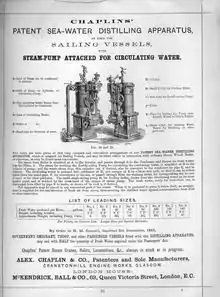 Alexander Chaplin & Co. (also known as A.C. and Co., Alex. Chaplin & Co.) was a manufacturing syndicate based in the United Kingdom during the mid-19th century to early 20th century with its manufacturing and engineering plant facilities located at Cranstonhill Engine Works, Glasgow.[2] Of their numerous patented and manufactured products, one of the notable devices developed was the Chaplin's Patent Distilling Apparatus with Steam pump for circulating water attached.