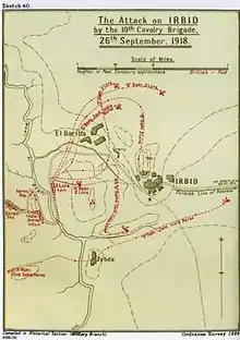 The 2nd Lancers' "C" Squadron was ordered to advance through the village of Bariha 1 mile (1.6 km) north-west of Irbid and get into position to attack Irbid from the east, "B" Squadron was to follow and attack mounted from the north while a third squadron (probably D Squadron), simultaneously attacked Irbid from the south with "A" Squadron in reserve. The machine gun squadron was to target attacking machine guns. (See Falls Sketch Map 40 for movements of "A" and "D" Squadrons)[1]