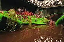 Willy Wonka's Chocolate Room was built on Pinewood Studios' 007 Stage, one of the largest soundstages in the world. Sections of artificial grass were laid upon blocks of polystyrene foam that formed the shape of the landscape.[52] For the chocolate river, McDowell insisted on having the river look edible, saying "in the first film, it's so distasteful."[10] According to Tim Burton, "the important thing for me was that we wanted to give the chocolate river a really chocolatey feel, give it a weight, not just brown water. That's why we tried to use a real chocolate substitute, to give it a movement and texture."[21] Joss Williams oversaw the creation of a faux chocolate concoction, taking months to create a non-toxic edible substance with the right consistency.[53] The final mixture, developed by a UK-based chemical company called Vickers,[54] was a mix of water and a thickening agent known as Natrosol,[55] with food dye used to achieve the brown coloring.[40] The river was 270 feet (82 m) long, 6 feet (1.8 m) deep, and consisted of 192,000 US gallons (730,000 L) of faux chocolate while 30,000 US gallons (110,000 L) of the same material made up the waterfall.[46] Wonka's boat, used by the characters to travel down the chocolate river, took 20 weeks to build and incorporated 54 animatronic Oompa-Loompas, along with its own internal rowing mechanism.[56]