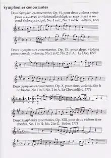 In 1773, when Gossec took over the direction of the prestigious Concert Spirituel,[lower-alpha 4] he designated Saint-Georges as the new conductor of the Concert des Amateurs.[43] After fewer than two years under the younger man's direction, the group was described by Jean-Benjamin de La Borde as "performing with great precision and delicate nuances", and that it had become "the best orchestra for symphonies in Paris, and perhaps in all of Europe."[44][45][46][lower-alpha 5] Saint-Georges was chosen as the dedicatee of another composition in 1778, this time for the unknown violinist Giovanni Avoglio's set of string quartets, Op. 6.[48][49]
