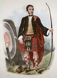 A Victorian era, romanticised depiction of a member of the clan by R. R. McIan, from The Clans of the Scottish Highlands, published in 1845.