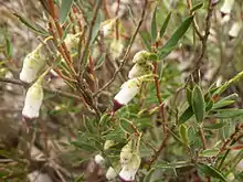 Conostephium pendulum, commonly known as pearl flower,[2] is a small, open shrub in the family Ericaceae endemic to the Swan Coastal Plain from Eneabba to Margaret River.