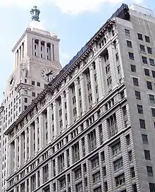 Illumination of the facade was a key part of the Hardenbergh design for the building: lamps were suspended beneath the cornice and on the roofline, and the storefronts at ground level were also illuminated. Even the use of limestone on the facade, instead of brick, was conducive to the illumination, as the limestone reflected the light generated by these lamps.[71] The Real Estate Record & Guide cited the building's exterior illumination scheme as being "as interesting an example of decorative exterior lighting as has ever been attempted in New York City."[73] Such illumination had been used previously in the city, notably at Luna Park and Dreamland amusement parks at Coney Island, as well as during the 1909 Hudson Fulton Celebration, when illumination was placed on the East River bridges and on major structures such as the Singer Building and the Plaza Hotel.[71] However, it was still relatively rare for office buildings to be illuminated each night, though such lighting schemes were commonly tested at the premises of power companies.[74]: 54, 98–101 The lighting scheme was scrapped in the 1920s when the Warren and Wetmore tower was built.[71]