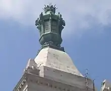 Rising above the base was a tower that was set back from the street, as required by the 1916 Zoning Resolution.[75] The ornamentation at the tower's peak included urns and obelisks, which were normally associated with funereal aspects, and was modeled after the Mausoleum at Halicarnassus.[63] These decorations memorialize Con Ed workers killed in World War I.[63][5] The tower section was topped by a "Tower of Light" designed to look like a miniature temple.[14] Just below the pinnacle is a recessed loggia of columns, which are illuminated in various colors at night.[5][4] Under the columns, the tower includes four 16-foot wide clock faces, one on each side of the building.[4] The tower also contains a set of bells, which strike every quarter-hour and are synchronized with a clock in Washington, D.C.[76] Measuring 400 feet (120 m) high,[76] the bells were the second-highest in the world at the time of their installation, behind those of the Metropolitan Life Insurance Company Tower.[77]