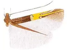 Female. Forewing length 4.9 mm. Head: frons shining white with greenish and reddish reflections, vertex neck tufts and collar shining olive brown with greenish and reddish reflections; labial palpus first segment very short, white, second segment three-quarters of the length of third, greyish brown with white longitudinal lines laterally and ventrally, third segment white, lined brown laterally, extreme apex white; scape dark brown with a white anterior line, white ventrally, antenna shining dark brown with a white line from base to two-thirds, interrupted in middle, followed towards apex by eleven dark brown segments, nine dark brown with a white line and eighteen dark brown segments at apex. Thorax and tegulae shining olive brown with greenish and reddish gloss. Legs: shining dark brown with reddish gloss, femur of midleg shining ochreous, femur of hindleg shining golden, foreleg with a white line on tibia and tarsal segments one, two and five, tibia of midleg with a white narrow oblique basal line, a white oblique medial line and a white apical ring, tarsal segment one with a lateral white line on the outside, ending dorsally at apex, segment two with a white oblique streak in the distal half and segment five entirely white, tibia of hindleg as midleg, but the markings silvery and with an additional broad pale golden subapical ring and long hair pencils before and after the medial line, tarsal segment four dorsally white at apex and segment five dorsally entirely white, spurs ochreous-white dorsally, dark grey ventrally, tips white. Forewing shining olive brown in basal one-quarter, darker brown towards apex and with reddish gloss, four very narrow white lines in the basal area, a subcostal from base to one-quarter, bending from costa in distal third, a medial above fold, from base to two-fifths, a very short subdorsal from one-fifth, a short dorsal from beyond base to one-fifth, an orange-yellow transverse fascia beyond the middle with a long apical protrusion from the middle and as an apical line to apex, bordered at the inner edge by a tubercular very pale golden metallic fascia with greenish and reddish reflections, subcostally on outside with patch of blackish scales, bordered at the outer edge by two very pale golden tubercular costal and dorsal spots with purplish reflection, the costal spot as a streak of one-quarter wing length, the dorsal spot more or less square and more towards base than the costal, both spots lined brown on the inside, a white costal streak beyond the costal spot, cilia brown, slightly paler towards dorsum. Hindwing shining brown with strong reddish gloss, cilia brown. Underside: forewing shining dark brown, the pale yellow apex line distinctly visible in the cilia as a white streak, hindwing shining dark brown. Abdomen not examined, previously used for dissection.[1]