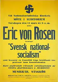 Count Carl Gustaf Bloomfield Eric von Rosen (2 June 1879 in Stockholm – 25 April 1948 Skeppsholmen, Stockholm) was a Swedish honorary doctor, patron, explorer, ethnographer, prominent figure in the Swedish upper class and a leading figure in Sweden's own national socialist movement in the 1930s.