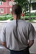 Rattail Hair that has been grown out long and shorn, or 'buzzed' except for a long, thin braid at the very top of the neck.