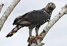 The crowned eagle, also known as the African crowned eagle or the crowned hawk-eagle (Stephanoaetus coronatus), is a large bird of prey found in sub-Saharan Africa; in Southern Africa, it is restricted to more easterly areas.[2] Its preferred habitats are principally riparian woodlands and various forests.[2] The crowned eagle is the only extant member of the genus Stephanoaetus. A second species, the Malagasy crowned eagle (Stephanoaetus mahery), went extinct after early humans settled on Madagascar.[3]