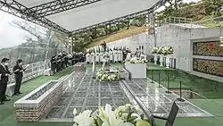 At around 8:20 am, Lee's family members, with Lee's granddaughter Kun-yi and grandson-in-law carrying the cremation urn and the portrait, departed from his family residence and reached the military cemetery an hour later.[29][30] They were greeted by President Tsai, Vice President Lai, Presidential Office Secretary-General David Lee and Deputy Secretary-General Lee Chun-yi, Interior Minister Hsu Kuo-yung and Defense Minister Yen Teh-fa.[29] The ceremony was officiated by Pastor Ng Chhun-seng and Elder Chueh Chang-meng of Che-lam Presbyterian Church.[31] In Ng's sermon, he encouraged the Taiwanese people to be inspired by Lee's "Jade Mountain spirit" and to dedicate themselves to their home Taiwan.[31] The interment was followed by a three-volley salute by the Military Police Honour Guard and the "Last Post" played by the military band.[32]