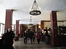 Having chosen King's novel as a basis for his next project, and after a pre-production phase, Kubrick had sets constructed on soundstages at EMI Elstree Studios in Borehamwood, Hertfordshire, England. Some of the interior designs of the Overlook Hotel set were based on those of the Ahwahnee Hotel in Yosemite National Park. To enable him to shoot the scenes in loose chronological order, he used several stages at EMI Elstree Studios in order to make all sets available during the complete duration of production. The set for the Overlook Hotel was at the time the largest ever built at Elstree, including a life-size re-creation of the exterior of the hotel.[31] In February 1979, the Colorado Lounge set at Elstree was badly damaged in a fire, causing a delay in the production.[32][33][34]