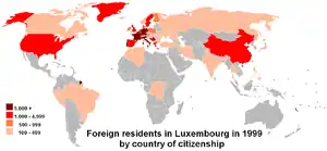 Luxembourg does not formally collect ethnic or racial data of its citizens.[11] The foreign population resident in Luxembourg currently numbers over 296,465, corresponding to 47.4% of the total population (compared to 13.2% in 1961).[3] That means there are currently almost as many immigrants as there are native citizens. These immigrants are overwhelmingly[12] nationals of EU countries (accounting for over 80%), by far the greater part of whom originally come from Portugal, Italy and the two neighbouring countries, France and Belgium. For some years, there has also been a large increase in the number of immigrants and asylum seekers from the countries of Eastern Europe, and especially the new republics to have emerged from the former Yugoslavia (Bosnia and Herzegovina, Serbia and Montenegro). These immigrants include a considerable proportion of young people. Immigrants (especially asylum seekers) have a strong impact on the birth rate, accounting for nearly 50% of births in Luxembourg.