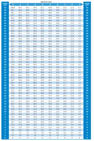 gives the proportion of the combined run scoring resources of the innings remaining when overs are left and wickets are down.[11] These proportions can be plotted in a graph, as shown right, or shown in a single table, as shown below.