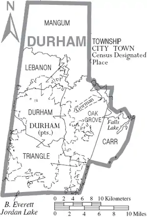 • Durham (county seat and largest community; small portions extend into Wake and Orange counties)