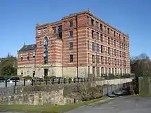 The original building, built in 1871, was burned out in 1886 and was rebuilt in 1887 as the present building, which is Grade II listed.[5] It is built of brick in 5 storeys with stone banding and a slate roof and a rectangular floor plan of 14 by 6 bays. It was mainly used for finishing and winding until 1903, after which it carried out twisting and winding.