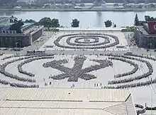 Children make the emblem of the Workers' Party of Korea as they practice for a torch march on Kim Il Sung Square in Pyongyang, 2012.