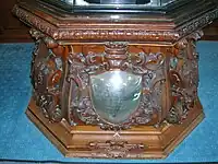 The glass case that covers the trophy has wooded framed sections and rises up from an ornately carved eight-sided wooden base emblazoned with four coats of arms, earls coronets, and with a silver engraved dedicatory shield. This base stands around 2 feet and 10 inches (85 cm) in height.[1] The dedicatory shield reads "Presented to Archibald, Earl of Eglinton, by the Visitors to the Eglinton Tournament held at Eglinton Castle. MDCCCXXXIX."