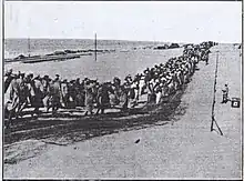 Beside the pipelines and the railway, hundreds of miles of wire netting roads were laid across the sand and pegged down, and great reservoirs, to hold huge quantities of water supplied by filters at a rate of 500,000 imperial gallons (2,000 m3) a day, were constructed. At the beginning of December 1916, the Egyptian Expeditionary Force had a strength of 150,000 British, Australian and New Zealand and 6,000 Indian troops, and 13,000 Egyptian labourers.[12][13]