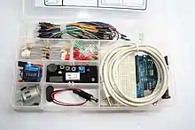 An electronic kit is a package of electrical components used to build an electronic device. Generally, kits are composed of electronic components, a circuit diagram (schematic), assembly instructions, and often a printed circuit board (PCB) or another type of prototyping board.