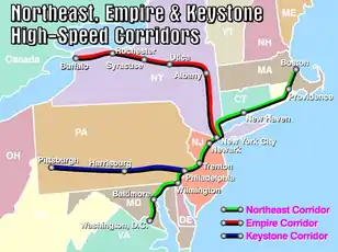 Empire Corridor (red) as designated by the Federal Railroad Administration