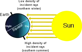 Diagram of the seasons, showing the situation at the December solstice. Regardless of the time of day (i.e. Earth's rotation on its axis), the North Pole will be dark, and the South Pole will be illuminated; see also polar night. In addition to the density of incident light, the dissipation of light in atmosphere is greater when it falls at a shallow angle.